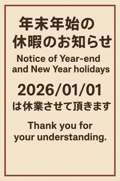年末年始の休暇のお知らせ2026/01/01を休業させて頂きます。ご了承の程よろしくお願い致します。Notice of Year-end and New Year holidays. Only 2026/01/01 Thank you for your understanding.